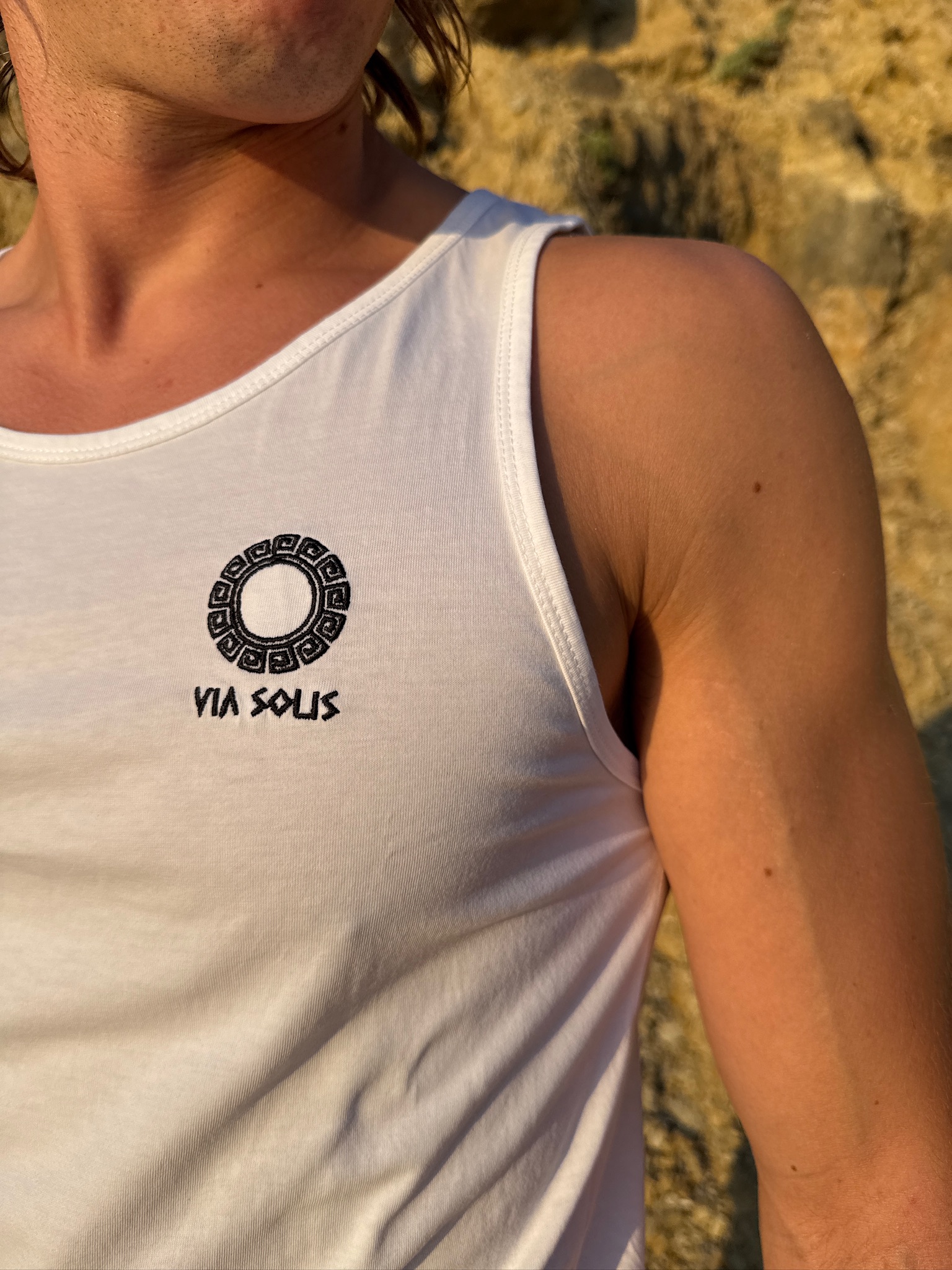 •100% Algodón orgánico, origen Portugal. 160 gramos. •Camiseta blanca de tirantes con bordado negro de nuestro logo. • Un básico ideal para todo tipo de deportes, pero orgánico.