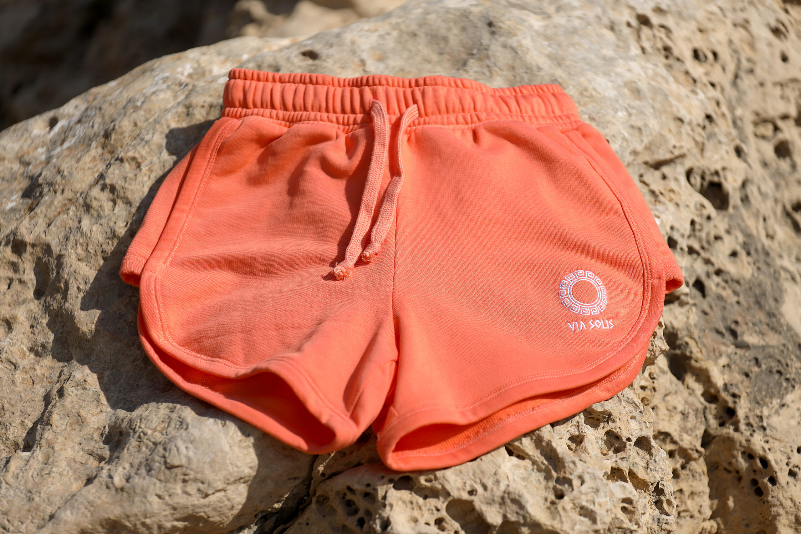 •Pantalón corto color naranja coral con bordado en blanco de nuestro logo en parte frontal izquierda.